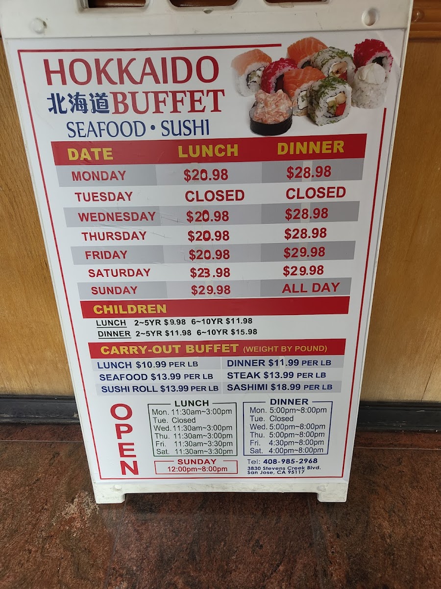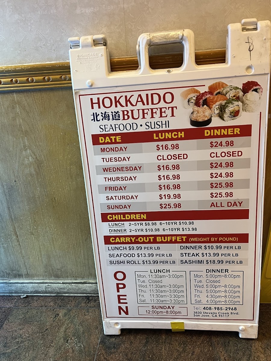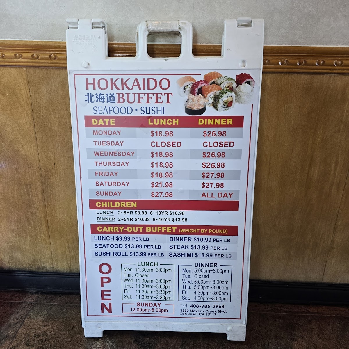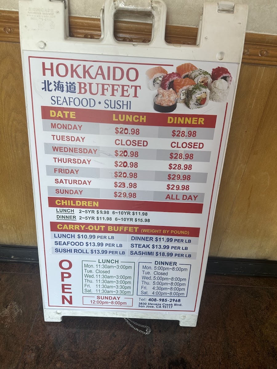 In addition to the buffet selections, the menu highlights a range of sushi and sashimi options, including sushi combos, California rolls, and fried shrimp. Fresh fruit and dim sum are also part of the offerings, broadening the variety available.