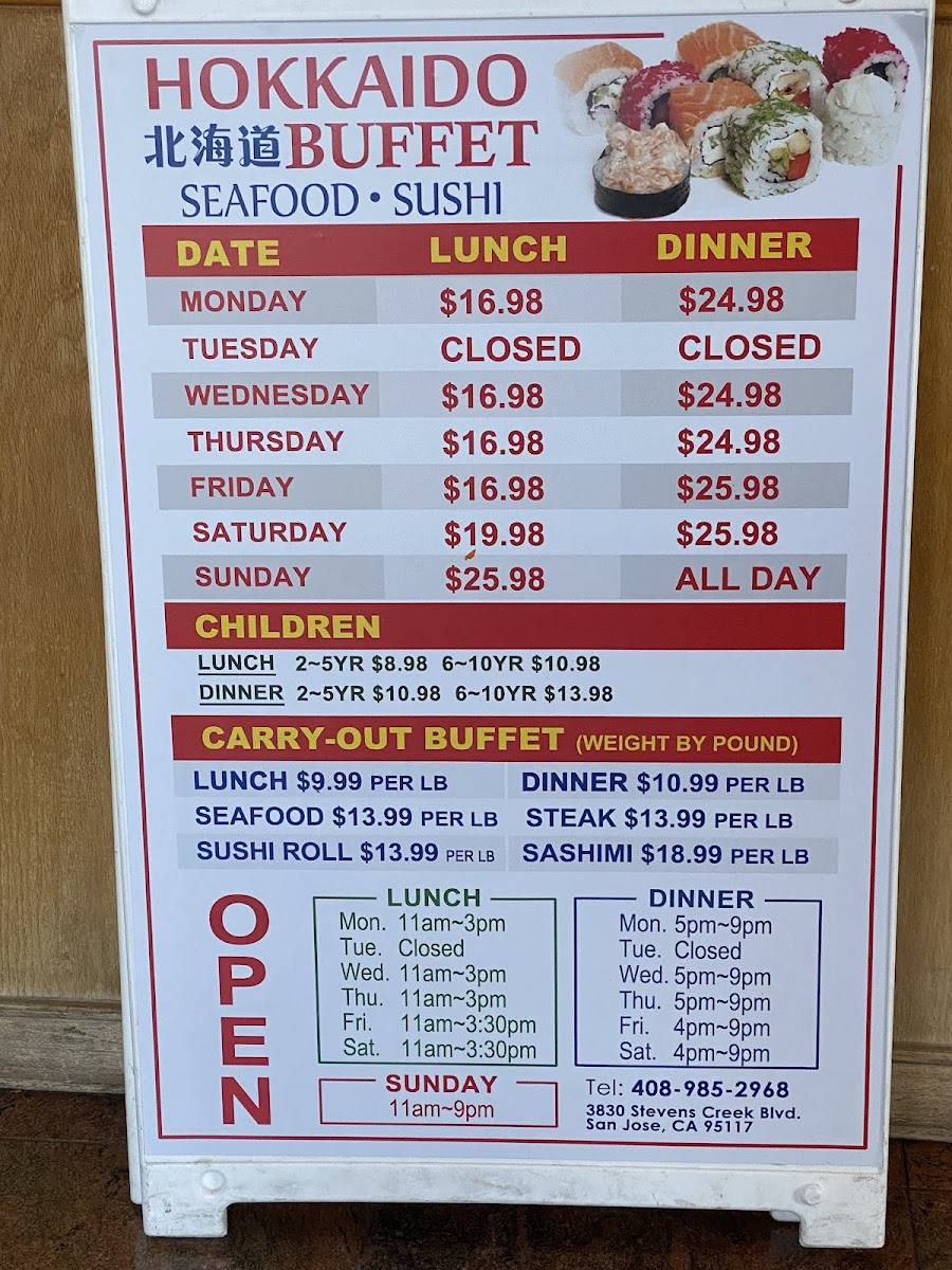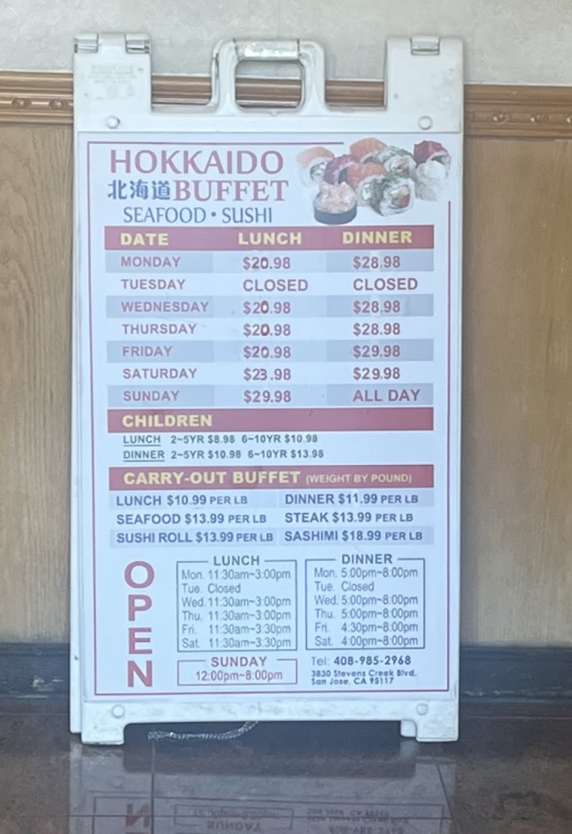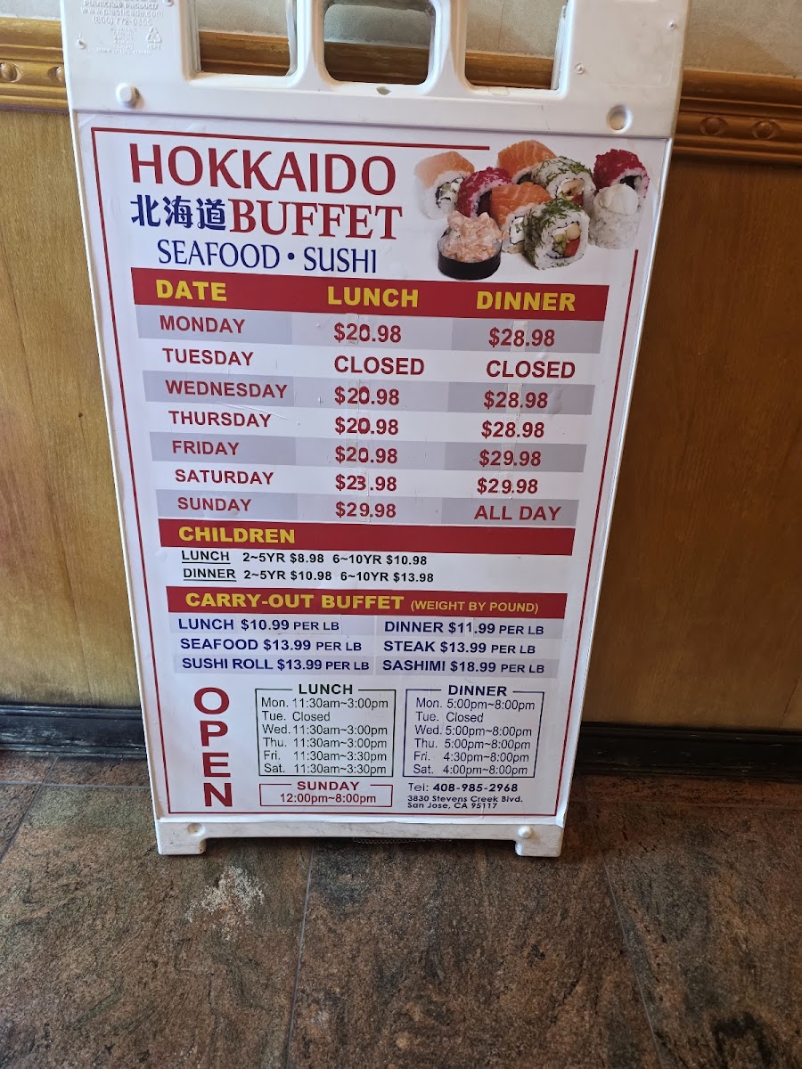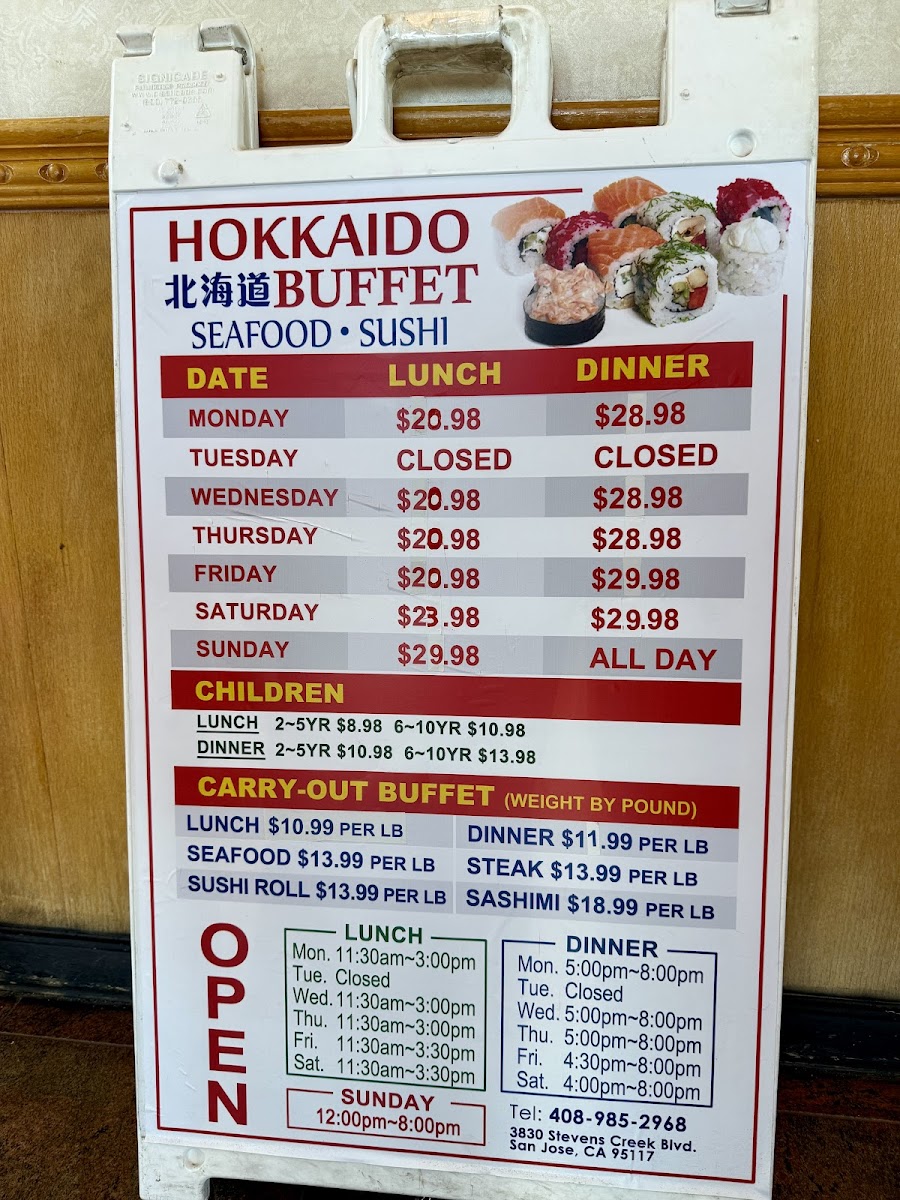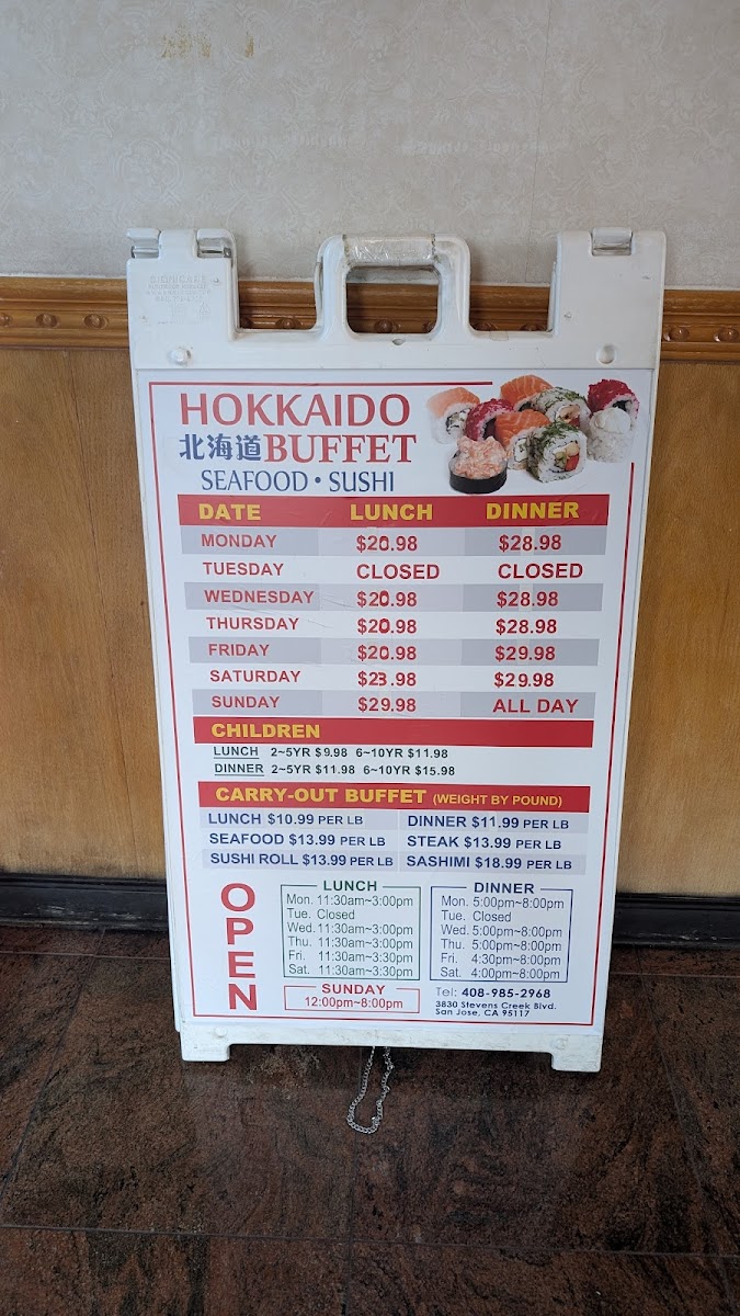 In addition to the buffet selections, the menu highlights a range of sushi and sashimi options, including sushi combos, California rolls, and fried shrimp. Fresh fruit and dim sum are also part of the offerings, broadening the variety available.